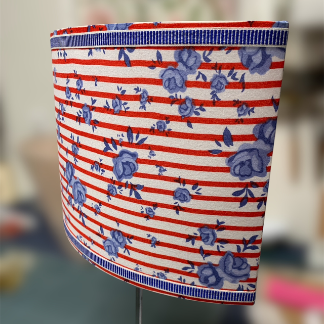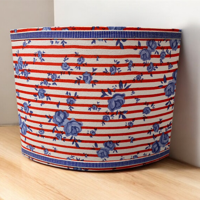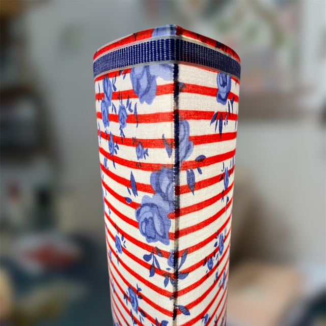 Tissu 100% coton. Imprimé rayé rouge et fleurs bleues contrecollé sur un polyphane opale. Galon rayé blanc/bleu en coton