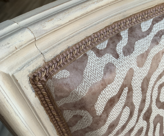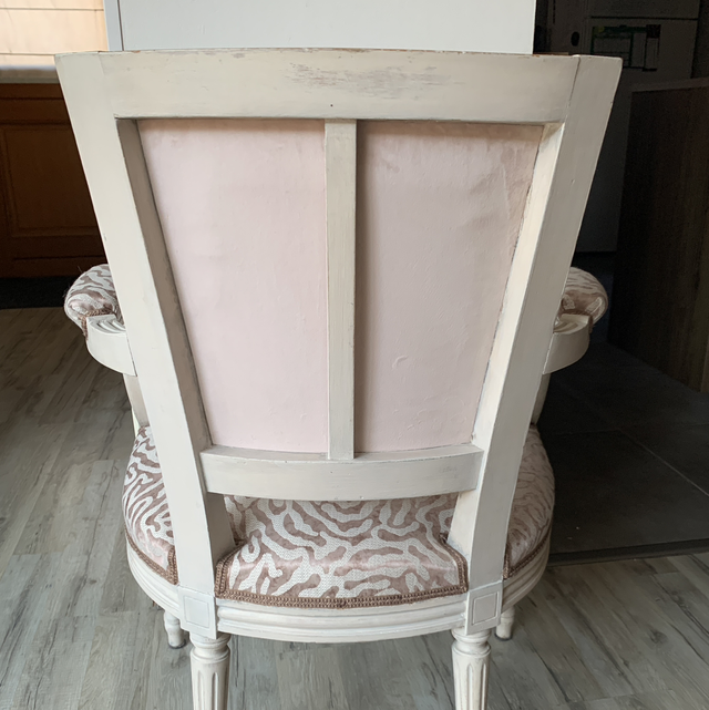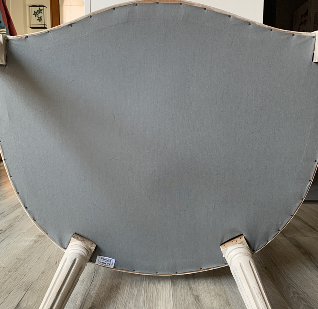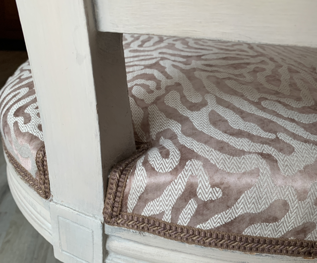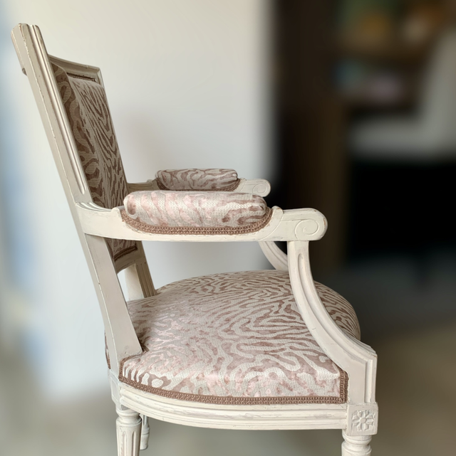 Fauteuil cabriolet de style Louis XVI entièrement restauré en mousse bultex, tissu beige rosé et galon de passementerie d’éditeur.